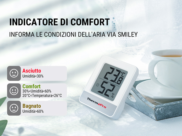 Igrometro Per Interni HUALANS Termometro Igrometro Digitale Professionale Con Touch-Button, Termometro Ambiente Termoigrometro Interno Retroilluminazione Monitor Temperatura Umidit%c2%a8%c2%a4 Da Interno Batterie Escluse Termometro Neonato Letture di precisione intelligenti Sensore accurato aggiornato per aiutarti a ottenere con precisione la temperatura e l'umidità. ThermoPro TP49 Mini Igrometro Termometro Digitale da Interno . Termoigrometro da Interno per Casa Monitor di Temperatura e umidità per Ambienti con Livello di Comfort, Bianco. Precisione. ... Il termometro igrometro casa con sensore di temperatura e umidi Indicatore di comfort Il termometro domestico con faccine sorridenti mostra contemporaneamente il diverso livello di umidità, puoi conoscere il livello di comfort interno a colpo d'occhio - sapere quando deumidificare o umidificare. Due modalità di installazione: posizionare sul tavolo o fissare al muro Ampio intervallo di misurazione: intervallo di misurazione della temperatura: -50 ℃ ~ 70 ℃; Intervallo di misurazione dell'umidità: 10%RH-99%RH Visualizza temperatura e umidità Mini termoigrometro: 45*45*16 mm Specifiche del prodotto Intervallo di misurazione della temperatura: -50 ℃ ~ 70 ℃ Precisione della misurazione della temperatura: ± 1 ℃ Risoluzione della temperatura: 0,1 ℃ Intervallo di misurazione dell'umidità: 10%RH-99%RH Precisione di misurazione dell'umidità: ±5%RH Risoluzione umidità: 1% Il pacchetto include: Termometro igrometro digitale Nastri biadesivi LR44 (incluso nel prodotto)