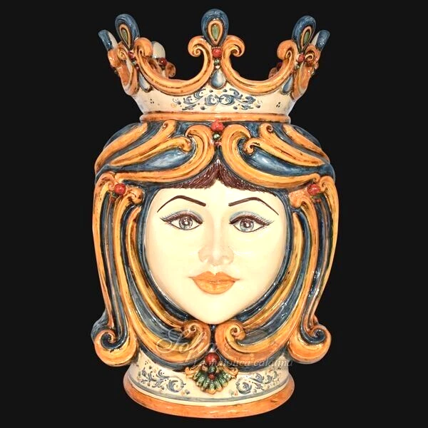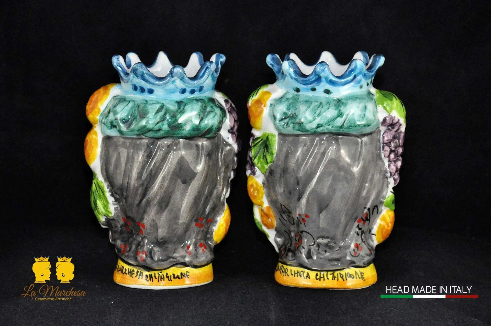 Simpatiche Teste di Moro in ceramica di Caltagirone con frutta. Interamente realizzate e decorate a mano ed impreziosite da smalto lucido in simil Cristallo Le nostre teste di moro vengono corredate da un'elegante pergamena che ne racconta la leggenda. Misure: Altezza 13 / 14 cm, Larghezza 9 cm, foro testa 5 cm (circa). Caltagirone Testa Di Moro In Ceramica Caltagirone H 13 / 14 Cm Ca. 1pz Con Corona E Frutta Teste Di Moro (1pz) Bianco Lucido Corona e Frutta Testa di moro in ceramica Caltagirone - h 13 / 14 cm ca.