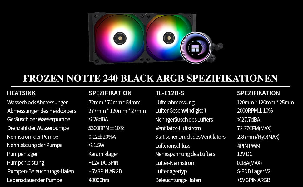 sul piatto forma CPU corrispondente, si consiglia di installare in base al video di installazione. 【Più ottimizzazione dei dettagli di raffreddamento】 La ventola del dispositivo di raffreddamento a liquido CPU integrata adotta il materiale PBT + PC di qualità di isolamento, il cuscinetto Stably-FDB risolve il problema di tremore della pala della ventola in modalità di sollevamento. Dissipatore Liquido 240mm Thermalright Frozen Prism 240 Black ARGB Radiatore Di Raffreddamento Ad Acqua 5V CPU Ventola Di Raffreddamento Liquido Per LGA1200 1700 115x AM4 AM5 Thermalright 360 【Doppio controllo della temperatura della ventola PWM】 Con la ventola della serie TL-E12B-S V2, la ventola della CPU con funzione di controllo della temperatura può regolare automaticamente la velocità in base alla temperatura, e l'iniezione dell'anello in rame con nucleo in acciaio rende il cuscinetto S-FDB della ventola più evidente, riducendo non solo l'attrito e le vibrazioni, ma riducendo anche il suono e prolungando la durata durante il Funzionamento L'alta velocità di 1850 giri/min combinata con il radiatore dell'acqua del processore può trasportare rapidamente la temperatura elevata. la durata del blocco d'acqua fino a 40.000 ore, velocità fino a 3300 giri/min ± 10%, per garantire un eccellente raffreddamento del processore a lungo termine.