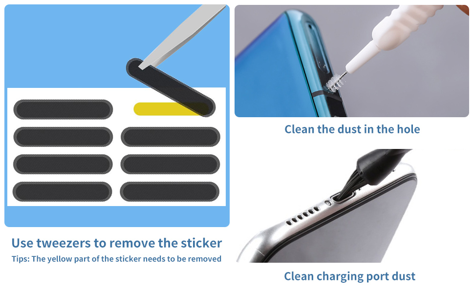 Il tappo antipolvere dell'altoparlante è realizzato in fibra ad alta densità, leggero e sottile e non diminuisce il volume dell'altoparlante. Il tappo antipolvere per altoparlante del telefono cellulare è progettato con rete antipolvere ad alta densità, che impedisce alla polvere di entrare e non influisce sul normale lavoro dell'altoparlante. Mayoii Set di 82 tappi antipolvere USB C, kit di tappi antipolvere di tipo C con 4 tappi antipolvere, 24 adesivi antipolvere per altoparlanti del telefono, 3 spazzole per la pulizia, 50 tamponi di Kit Pulizia Iphone Mayoii Set Di 82 , Kit Di Tappi Antipolvere Di Tipo C Con 4 Tappi Antipolvere, 24 Adesivi Antipolvere Per Altoparlanti Del Telefono, 3 Spazzole Per La Pulizia, 50 Tappi Antipolvere Usb C Facile da installare: inserire il tappo antipolvere USB C nella porta di ricarica e attaccare l'altra estremità del tappo antipolvere sul retro del telefono in modo da non perdere il tappo antipolvere. Le pinzette sono comode per agganciare l'adesivo dell'altoparlante. Materiali di alta qualità: il tappo antipolvere per cellulare di tipo C è realizzato in silicone di alta qualità, robusto e durevole, resistente all'usura, non danneggia il telefono. I 3 diversi tipi di spazzole e tamponi per la pulizia possono aiutarti a pulire la porta di ricarica del telefono, il foro dell'altoparlante e altre posizioni. Set di coperture antipolvere per cellulare: il nostro set di coperture antipolvere include 4 tappi antipolvere USB C, 24 adesivi a rete antipolvere per altoparlanti del telefono, 3 spazzole per la pulizia, 50 tamponi di cotone, 1 pinzetta.
