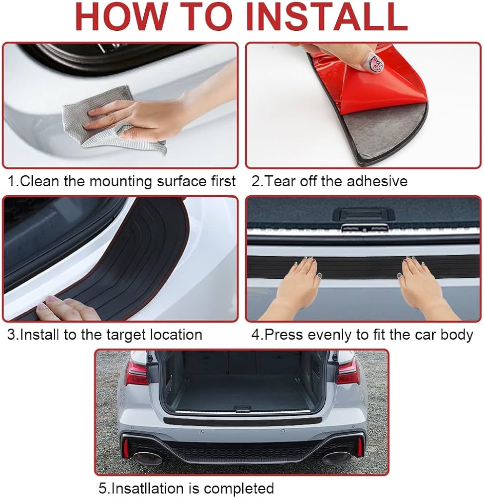 Gomma Antiscivolo Adesiva Protezione Paraurti Posteriore - Top 10 Protezione Paraurti Protezione Paraurti Auto Design antiscivolo: Superficie dotata di scanalature che prevengono lo scivolamento degli oggetti durante le operazioni di carico e scarico, aumentando la sicurezza e proteggendo il paraurti. Protezione efficace: Previene graffi, scalfitture e segni di usura causati dal carico di oggetti pesanti nel bagagliaio, conservando l'aspetto originale della vernice del paraurti. La protezione paraurti posteriore serve a proteggere la vernice da eventuali danni provocati dagli urti, quando si caricano oggetti nel bagagliaio. Serve a mantenere l’aspetto estetico, garantisce l’integrità della scocca ed evita la formazione di ruggine Installazione senza attrezzi: Dotata di nastro biadesivo pre-applicato sul retro per un montaggio rapido e semplice, basta rimuovere la pellicola protettiva e applicare direttamente sulla superficie.