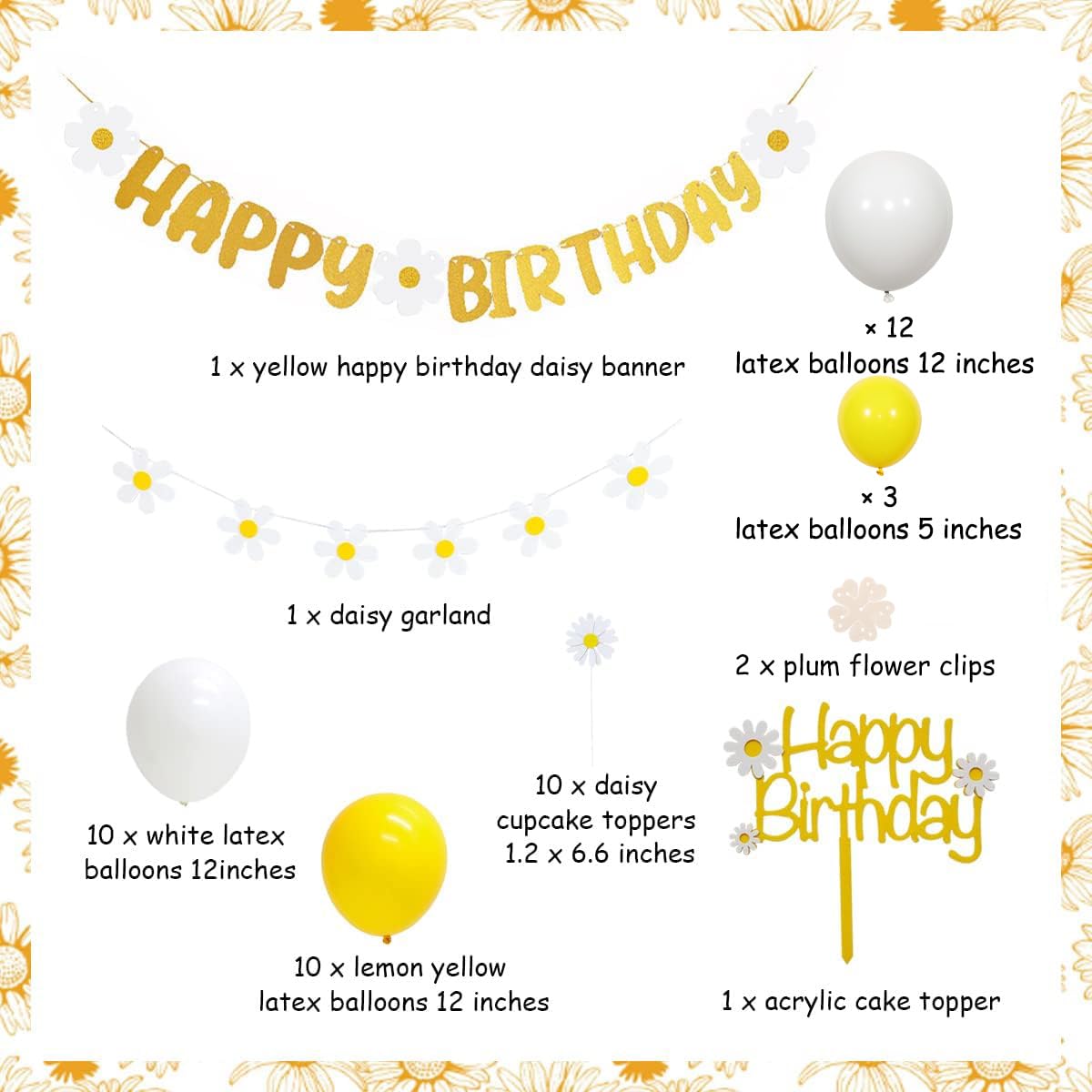 Decorazione Per Torta Di Compleanno Con Fiori A Margherita Decorazioni di compleanno Daisy: 1 striscione di buon compleanno di margherita gialla, 1 ghirlanda di margherite, 20 palloncini in lattice da 12 pollici, 12 palloncini in lattice da 10 pollici, 3 palloncini in lattice da 5 pollici, 1 torta acrilica di buon compleanno, 10 fiori di margherita cupcake toppers, 2 mollette per palloncini petali, 2 nastri bianchi 3 piedi. Palloncini margherite: Tutto quello che dovete fare è mettere un palloncino giallo da 5 pollici al centro della clip del petalo e 5 palloncini bianchi sull'anello esterno della clip del petalo per formare un piccolo palloncino margherita. Set di decorazioni per feste margherita con striscione di buon compleanno Daisy Flower Cake Topper per la decorazione della festa di compleanno della ragazza Festa di compleanno indimenticabile: queste decorazioni per feste di compleanno con margherite utilizzano elementi di piccole margherite per creare un'atmosfera rilassata e allegra, e hanno fornito lo sfondo perfetto per le foto di tutti, e renderanno la festa di compleanno della tua figlia molto abbagliante e lasceranno un profondo ricordo di compleanno.