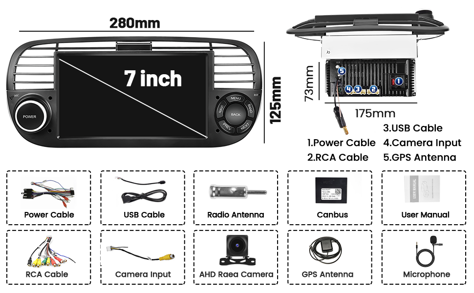 Radio FM RDS di alta qualità, supporta il salvataggio di 30 bande, ascolta musica, previsioni del tempo, informazioni sul traffico in tempo reale online, ecc, rende la guida meno noiosa Bluetooth FM RDS: L'autoradio per fiat 500 supporta la musica Bluetooth e le chiamate in vivavoce Bluetooth (incluso il microfono integrato ed esterno). Hikity Wireless Car Radio Hikity 1+32GB Android 13 Autoradio Per Fiat 500 2007-2015 Radio 7 Pollici Touch Display Stereo Auto Bluetooth Con Schermo WiFi Navi FM RDS Mirror Link SWC USB Telecamera Di Backup : Amazon.it: Elettronica Hikity Official Website 1 Package List 2 Wiring Port 3 Service Accedi facilmente a Internet collegando WiFi Hotspot e usa Youtube, Spotify e altre app che ti piacciono Lettore per auto multifunzionale: Lettore multimediale per auto con doppia porta USB, supporta una varietà di dispositivi esterni DAB OBD2 DVR ecc. Hikity Wireless Apple Carplay per Fiat 500 ( 2007 -2015)con Schermo da 7 Pollici Android 13 Touchscreen Autoradio Bluetooth con Navi . Specifiche tecniche: Sistema: Android 13 ; Dimensioni dello schermo:7'' Memoria Android 13 Autoradio Fiat 500: Autoradio Android per Fiat 500 2007 2008 2009 2010 2011 2012 2013 2014 2015. Processore a 4 core, 2GB RAM e 64GB ROM, funzionamento regolare; Potenza di uscita: 4*45W; Touch screen capacitivo da 7 HD, sensibile al tocco Autoradio con GPS WiFi: Autoradio per fiat 500 con ricevitore GPS integrato, apk di navigazione Here we go integrato, compatibile anche con Waze, iGo e altre app di navigazione. L'autoradio Bluetooth è dotata di telecamera AHD, che fornisce una chiara immagine in tempo reale della parte posteriore dell'auto durante la retromarcia, rendendo più facile e sicura la retromarcia
