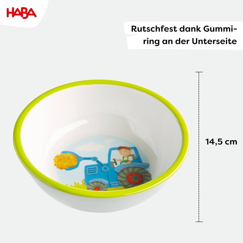 La robusta ciotola per bambini in melamina è lavabile in lavastoviglie e perfetta per ogni giorno Avviso di sicurezza Nessuna avvertenza Haba 302819 - Bol Tracteur - Vaisselle - Achat & Prix Descrizione Con la ciotola per bambini trattore di HABA ogni pasto diventa un piacere. La ciotola per trattore fa parte della gamma di stoviglie per bambini dal mondo a tema HABA. Non adatto per forno a microonde e forno Met de kinderschotel Tractor van Haba wordt elke maaltijd een plezier. Zodra de kom leeg is gegeten, glimlacht de kinderen de vriendelijke boer op zijn blauwe tracor van de bodem van de kom. Na het eten komt de onderhoudsvriendelijke kinderschaal van robu Dopo aver mangiato, la ciotola per bambini in robusta melamina arriva in lavastoviglie ed è pronta per il prossimo pasto. Un anello in gomma nella parte inferiore assicura che la ciotola non scivoli sul tavolo e il bordo alto facilita i primi esperimenti di cucchiaio. Il bordo alto e un anello di gomma nella parte inferiore facilitano ai principianti il cucchiaio di zuppa, porridge e cereali