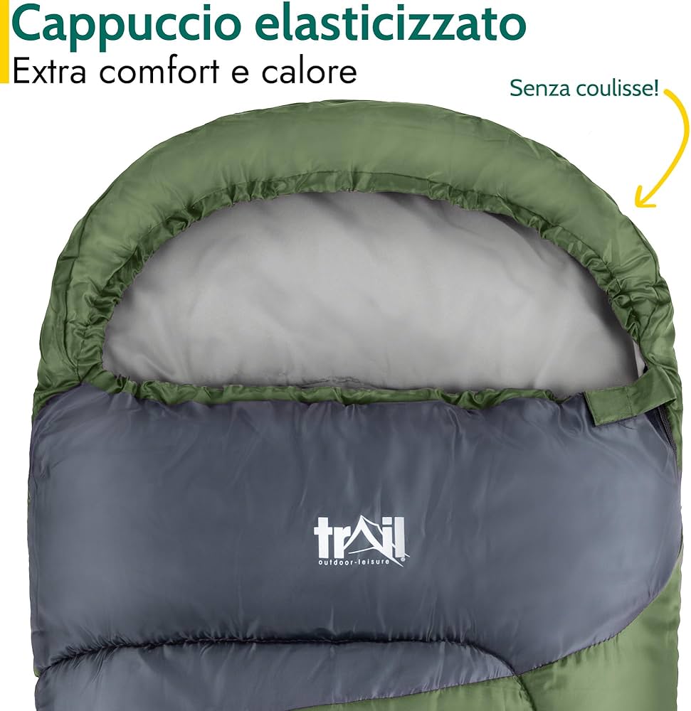 È progettato con un'imbottitura in fibra cava da 300 gsm, rivestimento esterno in poliestere 190T resistente all'acqua, e fodera traspirante in policotone morbida e delicata sulla pelle. Il sacco a pelo da campeggio è inoltre dotato di una leggera sacca di compressione che ti permette di riporlo e trasportarlo facilmente. LA SCELTA MIGLIORE PER OGNI STAGIONE: l'imbottitura in fibra cava da 300 gsm del nostro sacco a pelo campeggio 3 stagioni offre una temperatura di comfort di 0°C, e una temperatura estrema di -10°C per tenerti al caldo anche durante i mesi invernali più freddi. STILE MUMMIA E CALDO CAPPUCCIO CON COULISSE: il nostro sacco a pelo 3 stagioni a forma di mummia è stato appositamente progettato per tenerti al caldo. Trail Mummy Sacco a pelo per adulti, singolo, 3 stagioni, primavera, autunno, inverno, 300 g/m², impermeabile, campeggio all'aperto, tasche interne, borsa a compressione leggera Sacco A Pelo Matrimoniale Trail Sacco A Pelo Adulti Stile Mummia, Sacco A Pelo Compatto 3 Stagioni , Primaverile E Autunnale 300gsm Sacco A Pelo Leggero Con Tasche Interne E Borsa A Compressione Sacco A Pelo Invernale La cerniera a doppio cursore ti consente anche di cambiare il lato su cui si apre il sacco a pelo, a seconda che tu sia mancino o destrimano. La sua forma a mummia si adatta perfettamente al tuo corpo per intrappolare il calore naturale e proteggerti dal freddo. La sua temperatura massima di comfort di 10°C consente inoltre di utilizzarlo durante i mesi primaverili, autunnali ed estivi più freddi. Tieni il sacco a pelo leggero e compatto completamente chiuso per un calore ottimale o crea un'apertura lungo la cerniera per liberare il calore e rinfrescarti. CERNIERA ANTI INTOPPO A DOPPIO CURSORE: la cerniera a doppio cursore consente di regolare facilmente la temperatura all'interno.