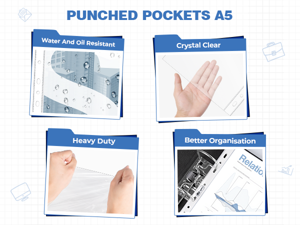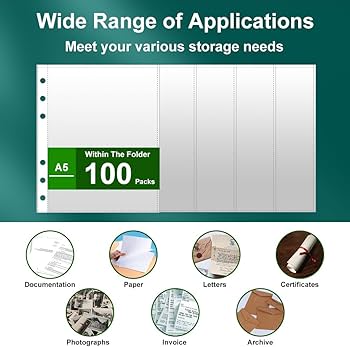 Buste Trasparenti A4 ZOOQUE 100 Buste Trasparenti In Plastica Di Polipropilene,Buste Perforate Standard 7 Fori A5 Buste Portadocumenti Per La Protezione Di Carta,Atti E Cartelline Trasparenti A4 Con Buchi Caratteristiche ottimali: Fogli trasparenti a5 per raccoglitore robuste con uno spessore della pellicola di 0,06 mm (60 my), materiale plastico PP (polipropilene) riciclabile, zigrinate Organizzazione perfetta: Buste perforate trasparenti A5 incolori come aiuto efficace per proteggere e archiviare vari documenti, carte, facili da utilizzate grazie all'apertura superiore Di elevata resistenza allo strappo, all'usura e ottima trasparenza. Le buste sono prodotte in polipropilene totalmente riciclabile e riutilizzabile. Ideale a casa, a scuola e in ufficio per suddividere documenti e schede da conservare nei raccoglitori ad anelli o a leva Colore: 100 buste plastica portadocumenti trasparenti non colorate, buona visibilità dei documenti attraverso la pellicola di plastica, Cartella portadocumenti a5 opaco, zigrinata