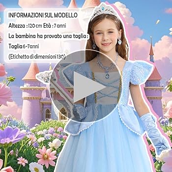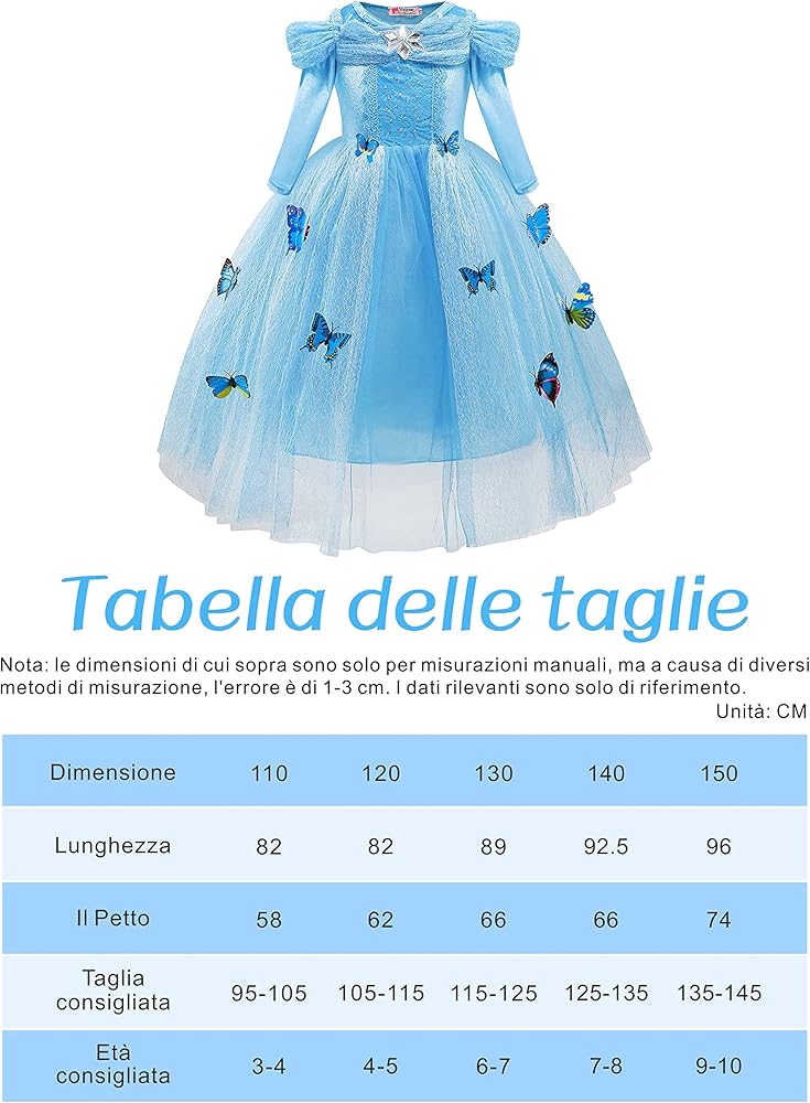 NOTA: Si prega di controllare attentamente le informazioni sulla taglia prima di acquistare. Inoltre, un abito da principessa di alta qualità richiede una buona cura, e si consiglia il lavaggio a mano. 🌊【Splendido Costume Cenerentola】- Il Cenerentola vestito da principessa presenta una delicata pizzo bianco con decorazioni di strass blu sul colletto ed è adornato con decorazioni floreali scintillanti. Regalo Perfetto per le Ragazze]- Questo set di Cenerentola vestito principessa è perfetto per le bambine di età compresa tra 2 e 11 anni come regalo. È adatto a varie occasioni come feste di compleanno, feste a tema, carnevale, Halloween, Natale e altre festività Il design della gonna in tulle a forma di fiocco di neve del costume Cenerentola è etereo e romantico, come entrare in un paese delle meraviglie. 🌊【Set Completo di Vestito Cenerentola】- Il nostro set di costume Cenerentola include un vestito Cenerentola, una corona, una bacchetta magica, una collana, un braccialetto, un anello, due orecchini e un paio di guanti. Vestiti Bambina Travestimento Da Principessa Cenerentola™ Con Corona Per Bambina - Vegaooparty Vestito Alice Nel Paese Delle Meraviglie Bambina Il costume Cenerentola è anche fornito con una mantella blu removibile, aggiungendo ulteriore fascino da favola. Il vestito Cenerentola è stampato con motivi chiari e elementi di carrozza di zucca, ritraendo perfettamente il tema di Cenerentola. 🌊【Modello Trasparente di Carrozza di Zucca】- Il vestito principessa Cenerentola presenta il blu come colore principale, splendidamente abbinato al bianco, proprio come in una fiaba. È adatto a varie occasioni come feste di compleanno, feste a tema, carnevale, Halloween, Natale e altre festività. L'insieme di accessori perfetto completerà il look e aggiungerà magia a qualsiasi occasione.