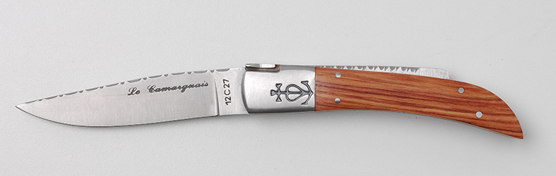 Il coltello forgiato tridente Camargue n°12 - Bois d'Amourette è lo strumento essenziale dei Guardiani per lavorare con i toros, è forgiato nella massa Bolt Socket Le Camarguais Trident Forgé N°12 - Bois D'Olivier Flow 004 CS23JE