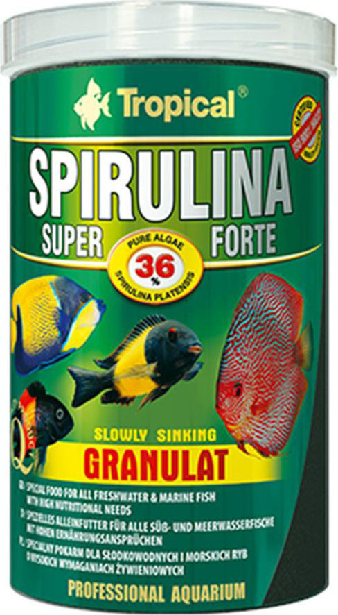 Mangime Per Pesci Tropicali Tropical Super Spirulina Forte Mini Granulat - 22g Spirulina Concentrata Mini mangime granulato ad alto contenuto (36%) di spirulina platensis alghe Somministrazione consigliata: più volte al giorno in piccole porzioni Descrizione. SUPER SPIRULINA FORTE MINI GRANULAT è un mangime granulato fine con un elevato contenuto (36%) di alghe Spirulina platensis. E' concepito per pesci d'acqua dolce e marini che richiedono un maggiore apporto di ingredienti vegetali nella loro d Per ciclidi africani e pesci acquatici marini che mangiano alghe