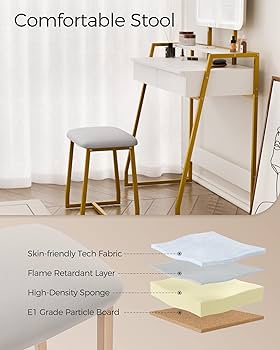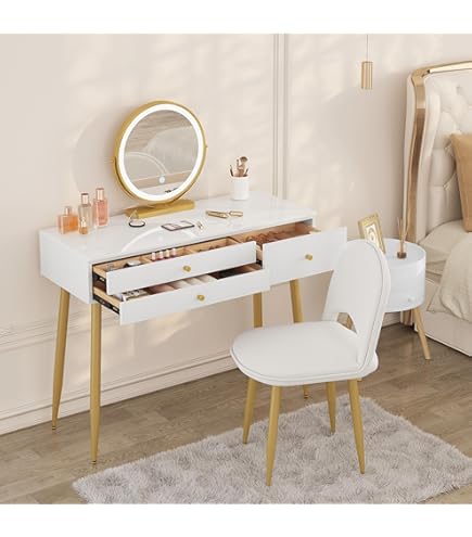 Toilette Da Trucco Toeletta Trucco Con Specchio Illuminato A LED, Tavolo Da Trucco Con Cassetto E Sgabello Imbottito, Tavolo Da Toeletta Moderno Con Specchio A Luminosità Regolabile, Per Camera Da Letto ( Color : White Toilette Trucco Con Sgabello [Design Moderno] - Il classico e intramontabile colore bianco con colore oro rende questo tavolo da toeletta semplice ma elegante e raffinato, che può essere perfettamente integrato nella vostra camera da letto; è anche una scelta ideale per fare regali alla vostra famiglia e agli amici durante la stagione delle feste. [Facile da Montaggio] - Ci sono istruzioni dettagliate e tutti gli accessori necessari nella confezione del prodotto, ogni parte degli accessori ha un numero corrispondente, se avete domande o bisogno di aiuto, non esitate a contattarci. Mondeer Toeletta Trucco con Luci LED, Tavolo da Trucco con Sgabello e Specchio, Luminosità Regolabile, 2 Ampi Cassetti e Ripiani, Struttura in Metallo, per la Camera da Letto, Bianco e Oro [Stabile e Durevole] - Questa cassettiera è realizzata con pannelli di particelle di grado E1 e metallo, il telaio in metallo rende la struttura complessiva più stabile, il carico massimo della scrivania è di 50 kg; il prodotto ha una superficie liscia, che è facile per la pulizia quotidiana e la manutenzione.