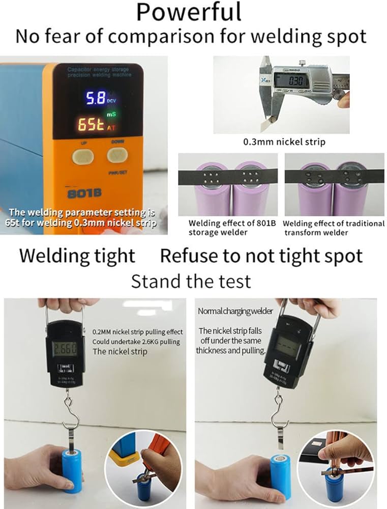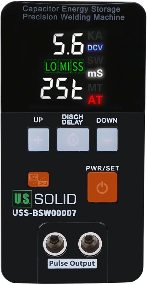 È possibile apportare comode regolazioni dei parametri premendo i pulsanti. Solid USS-BSW00005 è dotato di due super condensatori per l'accumulo di energia e l'alimentazione per la saldatura a impulsi. U.S. Solid USS-BSW05 Soudeuse par points de batterie 11,6 kW 2000 A Condensateur Stockage d'énergie Machine de soudage par impulsions Mini équipement de soudage par points portable pour batterie au Saldatrice A Batteria U.S. Solid USS-BSW06 14,5 KW 2500A Condensatore Energia Deposito Polso Saldatura Macchina, Mini Portatile Attrezzatura Saldatrice A Punti Per Batterie Due modalità di saldatura AT/MT - la modalità automatica 'AT' per una saldatura rapida e la modalità 'MT' controllata da pedale per principianti o per una saldatura precisa. (Si prega di notare che il pacchetto contiene solo la penna di saldatura predefinita 70B e il braccio di saldatura a spinta 73S per la saldatura del pacco batteria al litio 18650, è necessario un acquisto aggiuntivo per altri tipi di penna di saldatura) A differenza dei tradizionali saldatori per punti con trasformatore AC, è più portatile e non causa alcuna interferenza al circuito elettrico, eliminando i problemi di scatto. Sono disponibili numerosi accessori per penna di saldatura per diverse esigenze di saldatura. Il nuovo saldatore per punti a batteria ad alta frequenza U.S.