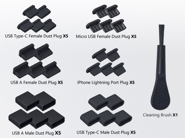 30 x USB Dust Cover Port Plug, 6 Types Silicone USB Cap Connector Stopper for USB Type-C , USB-C Male, Micro USB , HDMI Port , USB-A Female and Male Protection Kit with Cleaning Brush Brand ✅️[Tappi antipolvere per connettori USB] - Progettati per la protezione delle porte USB, 6 tipi di tappi antipolvere in silicone morbido e flessibile per porte USB Type-C, connettori USB-A femmina, connettori Micro USB, HDMI, connettori USB-C e connettori USB-A. ✅️[FACILE DA USARE E RIMUOVERE] - L'uso di tappi antipolvere in silicone garantisce una perfetta aderenza, consentendo di inserire e rimuovere facilmente questi tappi antipolvere. Tappo Antipolvere Usb C USB Cover Port Plug Caps - 30Pcs 6 Type Silicone Anti Dust Cover Laptop Port Protection Stoppers For USB Type-C, Headphone Port, HDMI, USB Tappi Usb ✅️[PROTEZIONE FACILE] - Specificamente progettato per proteggere la porta USB da polvere, sabbia, forfora, liquidi, sporco e pelucchi per evitare connessioni interne scadenti. Questi connettori hanno un profilo sottile che si integra perfettamente nell'aspetto del dispositivo.