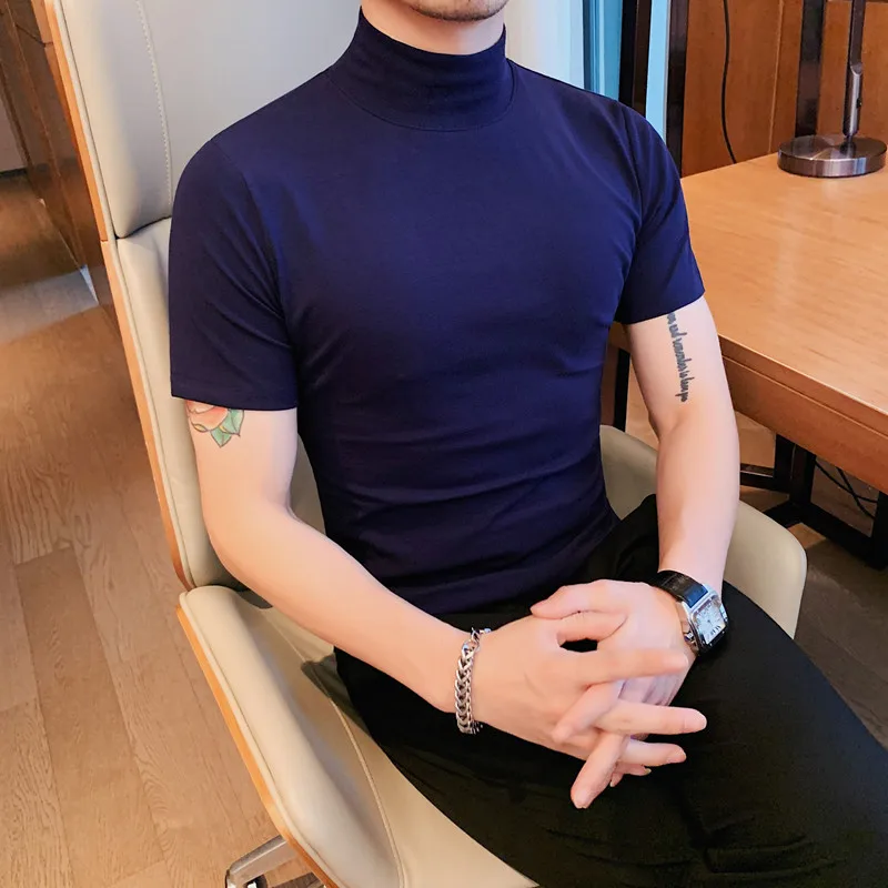 T-shirt Da Uomo Con Collo Alto, Maglietta Estiva A Maniche Corte, A Compressione, Tinta Unita, Da Uomo, Morbida, Casual, Elegante, Basic Top, X1 Marine, M