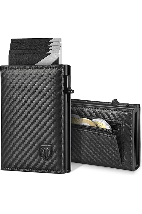 Il design del portafoglio con chiusura a bottone rende l'accesso alla carta più comodo e durevole. 【Nuovo design】 Questo portafoglio da uomo è dotato di una custodia per carte pop-up che può contenere fino a 6 carte ed è possibile accedere rapidamente alla carta desiderata con la semplice pressione di un pulsante. Portafoglio Uomo Manmaxim Slim Con Texture Di Alta Qualità, Pop Up Portacarte Slim Per 2 Finestra ID & 8 Credito Cartes, Porta Carte Uomo Con Blocco RFID Porta Tessere Con Monete (Nero Portamonete Uomo In questo modo, non solo è comodo al tatto, ma è anche abbastanza robusto con 6 anni di garanzia che il portafoglio non si usurerà o si staccherà. Il portafoglio ultrasottile si adatta perfettamente alla tua tasca ed è adatto per il trasporto quotidiano. È la scelta migliore per i popolari portafogli sottili da donna e da uomo, regalo perfetto per tuo padre, marito, figlio o per te stesso a Natale, compleanno, anniversario di matrimonio, festa del papà. 【Grande capacità】 Questo portafoglio minimalista misura 3,8 * 2,5 * 0,8 pollici, può contenere fino a 9-14 carte e 20 banconote. La pratica tasca portamonete con cerniera consente di riporre facilmente le monete. Proteggervi dal crescente rischio di borseggiatori elettronici.