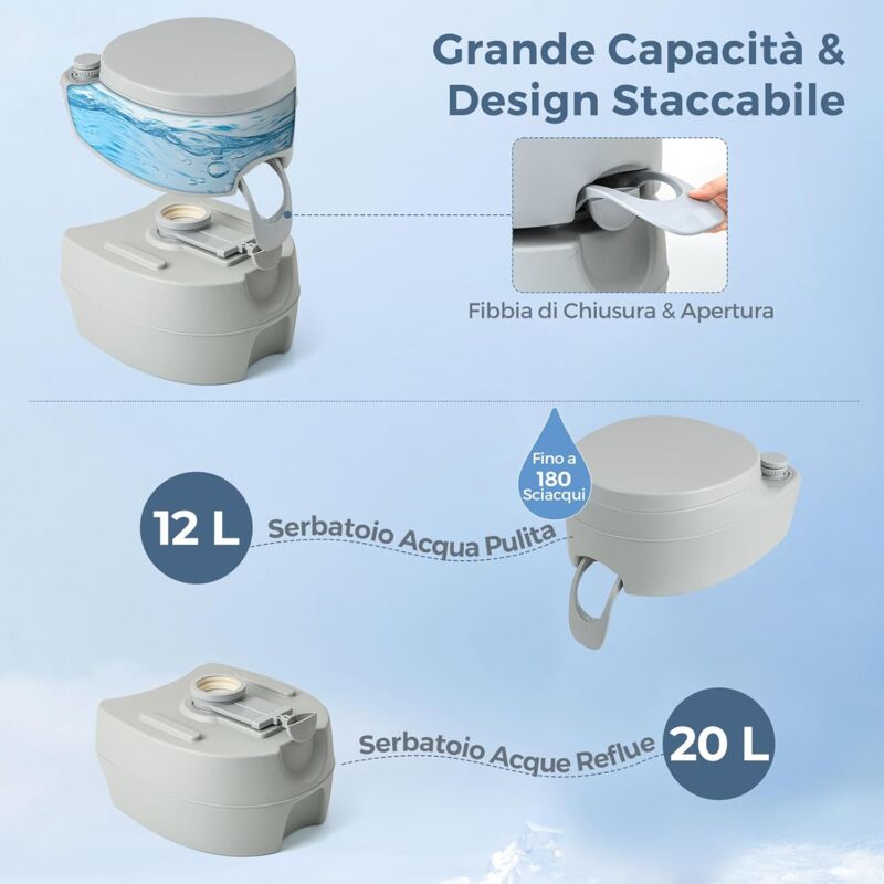 Wc Portatile VEVOR Toilette Portatile Da Campeggio 430 X 340 X 300 Mm Toilette Da Viaggio A Prova Di Perdite E Inodore Con Serbatoio Di Scarico Da 12 L Vasino Porta Per Auto Da Campeggio Per Adulti E Bambini Cassetta Scarico Wc Esterna Toilette portatile con scarico: niente più ricerche frenetiche del bagno più vicino in campeggio o in viaggio! IN STOCK: VEVOR Toilette Portatile da Campeggio 430 x 340 x 300 mm Toilette da Viaggio a Prova di Perdite e Inodore con Serbatoio di Scarico da 12 L Vasino Porta per Auto da Campeggio per Adulti e Bambini, DCX32GAL32GALYTV0V0 al miglior prezzo. Consegna rapida in tutta Italia Questa toilette compatta e dotata di tutte le funzionalità ti consente di goderti la natura e il tuo viaggio senza preoccupazioni. Il sedile e il coperchio del WC possono essere rimossi individualmente per una facile pulizia. Viene fornito con una borsa portaoggetti portatile: la toilette include una borsa portaoggetti, perfetta per l'uso durante le avventure all'aria aperta o i viaggi in campeggio, che la rende facile da trasportare e spostare, fornendo un sollievo immediato per le tue esigenze urgenti. A prova di perdite e riduce gli odori: la valvola di scarico con guarnizione scorrevole nella parte superiore del serbatoio di scarico, insieme a un anello di tenuta sull'uscita di scarico, garantisce un'eccellente tenuta, anche dopo 12 ore di immersione completa in acqua, evitando perdite durante i viaggi accidentati e riducendo gli odori quotidiani. Lavaggio pressurizzato con un massimo di 95 usi: il serbatoio di lavaggio da 3,2 galloni/12 litri è dotato di una pompa a pistone manuale per il lavaggio pressurizzato, che fornisce fino a 95 scarichi per riempimento, risparmiando acqua senza la necessità di ricariche frequenti.