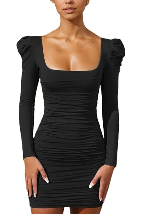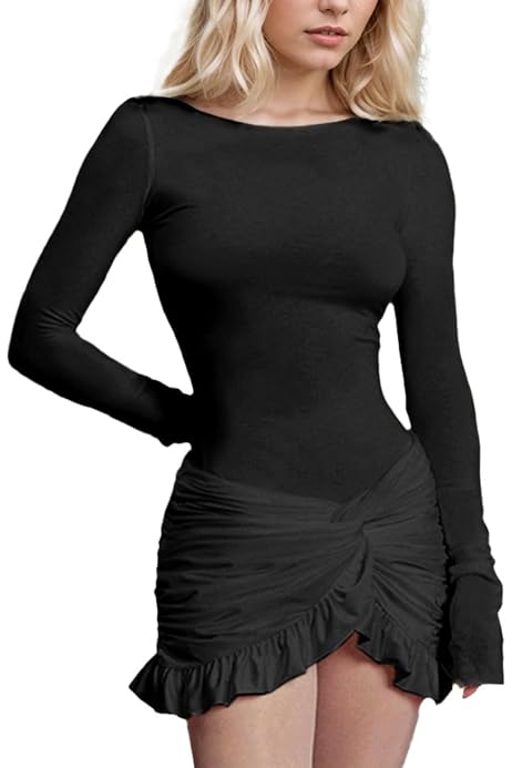 EMOTTOS Mini Abito Da Donna A Aderente, Abiti Da Cocktail Con Volant E Vita Elastica, Abito Bodycon Aderente Con Scollo Rotondo, Abiti Per Feste Clubbing E Cocktail Di Compleanno, Nero, S