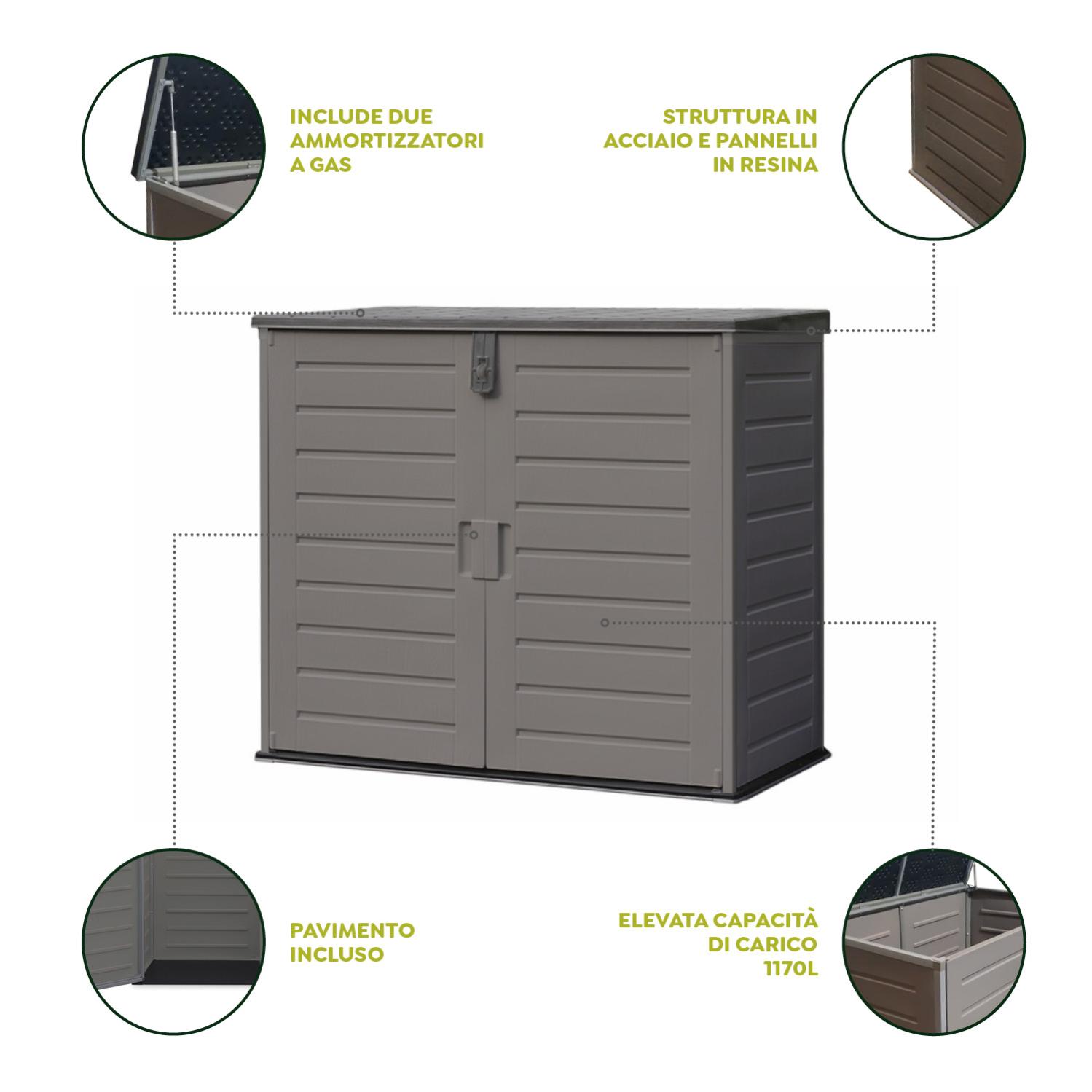 Wasabi - Armadio Da Esterno In Resina 1170L – 140x82x124cm – Pavimento Incluso - Porta Doppia E Coperchio Ribaltabile – Struttura In Metallo – Pannelli In Polipropilene – Chiusura Con Catenaccio : Amazon.it: Giardino E Giardinaggio
