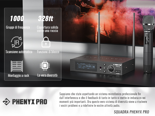 Il microfono cordless ha una cartuccia dinamica cardioide progettata per un suono chiaro e robusto. Si tratta di un sistema a quattro canali a frequenza selezionabile. Ideale per chiese, matrimoni, karaoke, DJ, discorsi in pubblico, ecc. Il design a 4 antenne aumenta la capacità anti-interferenza e diminuisce le interferenze tra ciascun canale. Siete invitati a rivolgervi a noi per la risoluzione dei problemi o la sostituzione di parti non funzionanti/difettose. Posso collegarlo direttamente ai diffusori? è possibile emettere il suono utilizzando l'uscita mista da 1/4'' o le due uscite XLR. Quante uscite ci sono nel ricevitore? Salve, grazie per la domanda! PRESTAZIONI PREMIUM WIRELESS: Sistema microfonico cordless UHF a 8 canali con frequenza selezionabile nella banda di frequenza di 500 MHz. È possibile utilizzare più di 10 sistemi contemporaneamente utilizzando la funzione di scansione automatica. Posso utilizzare il sistema wireless con il mio laptop, la mia fotocamera o il mio telefono? Posso utilizzarlo con ZOOM? Non lo consigliamo, poiché è stato progettato appositamente per applicazioni stereo. Un solo tipo di uscita sarà sufficiente per le vostre esigenze. Grazie. FUNZIONE DI SCANSIONE AUTOMATICA E ANTIINTERFERENZE: Il sistema microfonico karaoke wireless UHF è dotato della funzione di scansione automatica, che consente al microfono karaoke wireless di cercare il canale con meno interferenze per accoppiarsi con i trasmettitori. PRESTAZIONI PREMIUM WIRELESS: sistema e microfono wireless UHF a 4 canali con frequenza selezionabile. Canale 1: 538,3 - 10 Phenyx Pro offerte disponibili da: Amazon negozi, a partire da 29,99 Per collegarlo a una scrivania con MIC e jack per cuffie separati, è sufficiente utilizzare l'adattatore da 6,3 mm a 3,5 mm incluso nella confezione. Karaoke Professionale Completo Phenyx Pro Sistema Microfono Wireless Professionali UHF A 4 Canali Con Shure Sm58 Utilizza la sincronizzazione IR senza problemi per accoppiare il ricevitore e i microfoni cordless senza problemi in pochi secondi, con cadute minime e massima reiezione del feedback. SERVIZIO DEDICATO: I prodotti audio originali Phenyx Pro sono accompagnati da una garanzia del produttore di 12 mesi e da un servizio clienti di supporto. La frequenza è fissa sui singoli microfoni? NO.