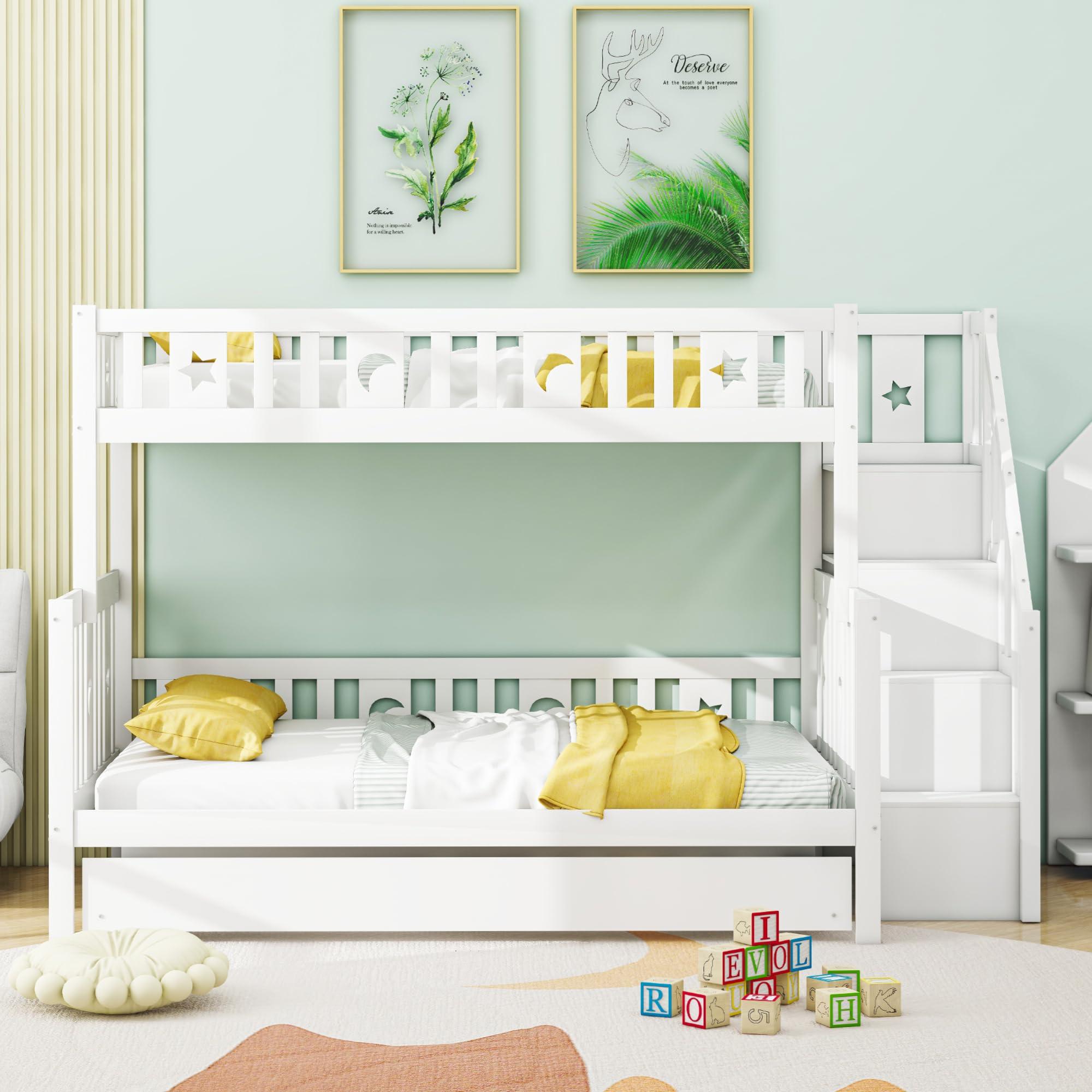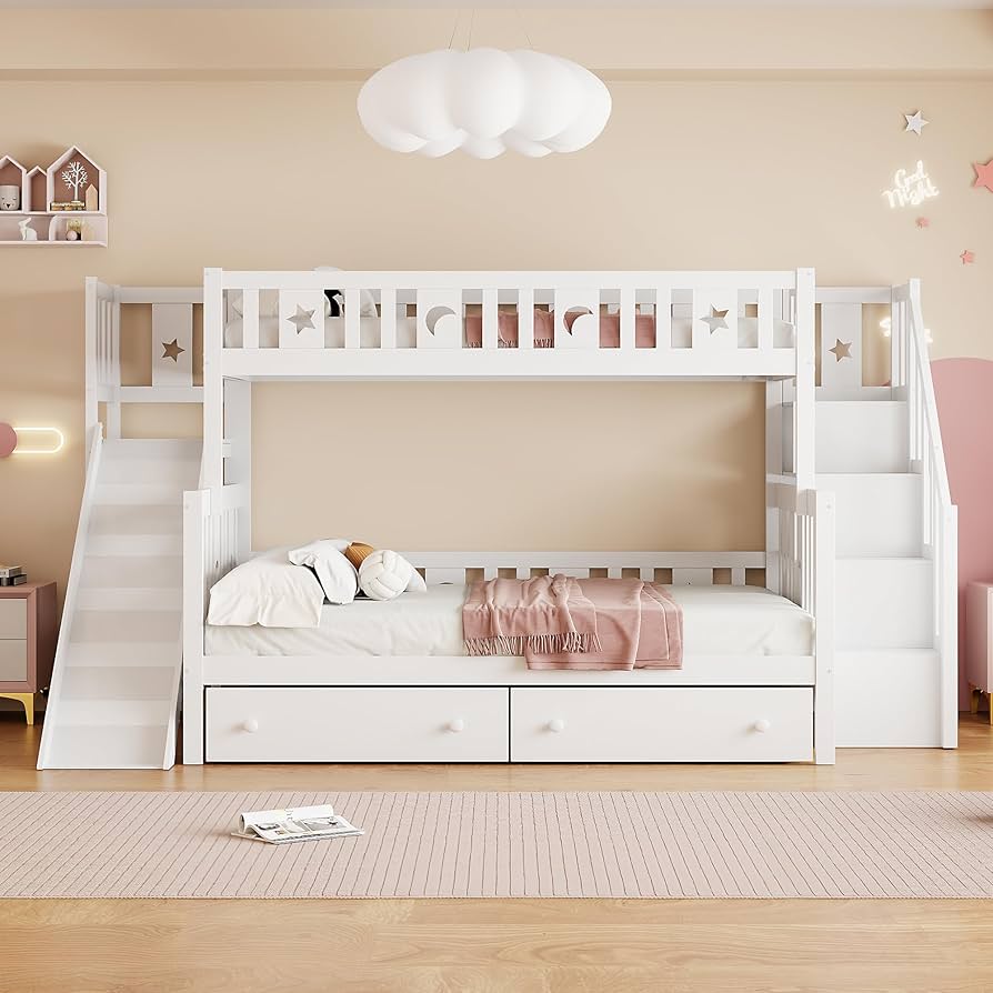 Descrizione prodotto Descrizione: Questo è un versatile letto a castello per bambini. Formato dettagliato: si prega di fare riferimento all'immagine delle dimensioni Quantità della confezione: 4 Peso complessivo: 103 kg. Il classico colore bianco si adatta perfettamente a qualsiasi stile di interni. Inoltre, le gambe in legno di pino massiccio garantiscono una maggiore stabilità e durata. 5. Struttura letto matrimoniale facile da montare. Numero di lamelle: 30 Richiede Spring Box: no. Con dimensioni 90 x 200 cm per la parte superiore e 140 x 200 cm per il piano inferiore, questo letto a castello per bambini è perfetto per la cameretta dei bambini, dove è possibile sfruttare al meglio lo spazio 3. Ampio spazio di archiviazione: questo letto a castello dispone di superfici di appoggio sia nella zona dello scivolo di sicurezza che nell'area dell'arrampicata di sicurezza, rendendo questo letto molto capiente. Il letto superiore misura 90x200 e il letto inferiore misura 140x200. Il letto a castello è dotato di uno scivolo di sicurezza e di una scala di sicurezza su entrambi i lati e di un ampio spazio di archiviazione che facilita l'arrampicata del bambino e allo stesso tempo offre spazio aggiuntivo per massimizzare l'utilizzo di questo letto in legno massiccio. Dimensioni complessive del letto: 283 x 163 x 160 cm. Gambe in legno di pino massiccio di alta qualità e un robusto telaio garantiscono stabilità e durata con un uso a lungo termine. Consigliamo uno spessore del materasso non superiore a 12 cm. A volte quattro scatole non arrivano lo stesso giorno. I letti a castello multifunzione con spazio di archiviazione sono versatili. Con dimensioni 90 x 200 cm per la parte superiore e 140 x 200 cm per il piano inferiore, questo letto a castello per bambini è perfetto per la cameretta dei bambini, dove è possibile sfruttare al meglio lo spazio. 3 Questo letto a castello in legno massiccio è dotato di uno scivolo di sicurezza con spazio e di una scala da arrampicata di sicurezza, che facilita l'ingresso e l'uscita dei bambini, mentre la scala può essere utilizzata come pratica superficie di appoggio che offre spazio aggiuntivo. 2. Design versatile e unico. Capacità di peso: letto superiore: 110 kg, letto inferiore 150 kg Spessore del materasso consigliato: non più di 12 cm. Colore: bianco. Letto A Castello Per Bambini Moimhear 90 X 200 Cm + 140 X 200 Cm, Letto A Castello Con Scaffale, Letto Letto A Castello 3 Posti Il telaio del letto è dotato di una combinazione di doghe in modo che non siano necessarie molle del letto. Assicurati di seguire attentamente le istruzioni di assemblaggio per garantire stabilità e sicurezza. 1. Con scivolo di sicurezza e scala di sicurezza. Il bellissimo motivo a stelle e luna rende questo letto un design unico per il vostro lettino. Dimensioni complessive: 283 x 163 x 160 cm.