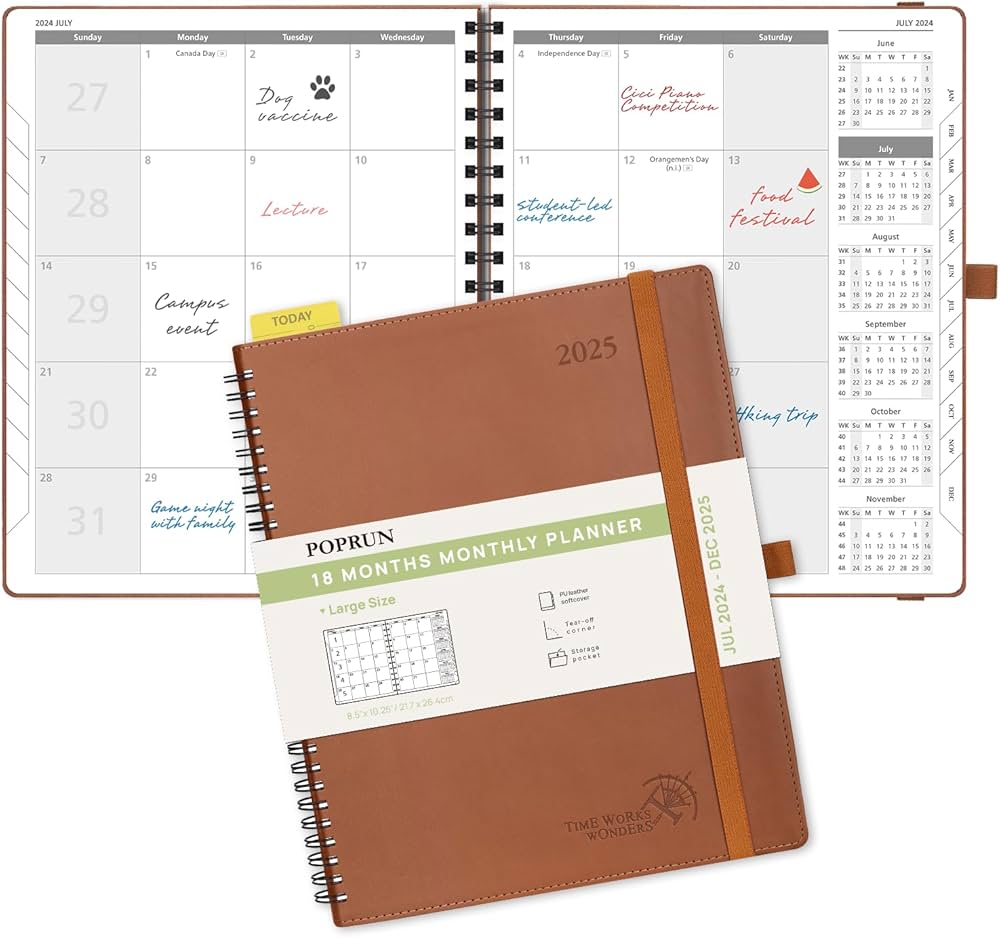 POPRUN Agenda Mensile 2025, 26,5 X 21,5 Cm (18 Mesi: 24 Luglio - Dicembre, 25 Dicembre), Visualizzazione Mensile Con Copertina Morbida, Copertina Morbida, Inizio Domenica, Linguetta Mensile (marrone