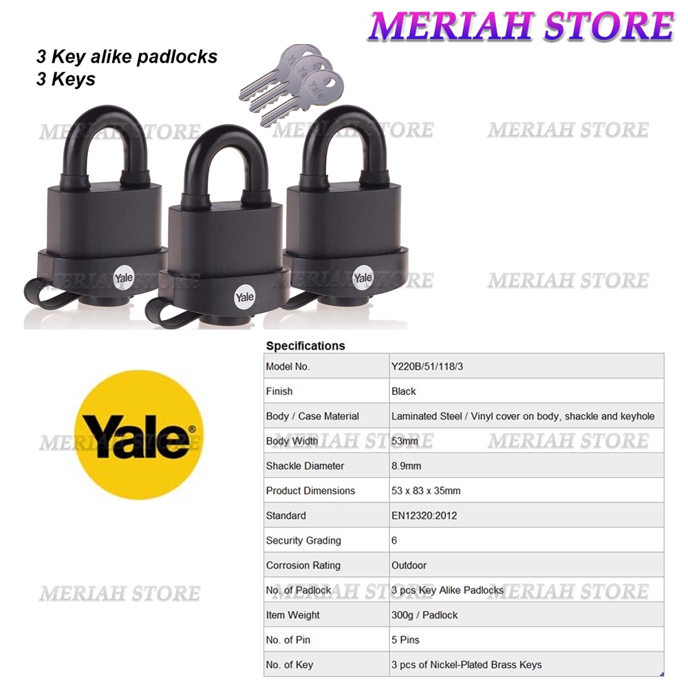 Buy Yale - Y220B/51/118/3 High Security 51mm Weatherproof Padlock, Pack of 3 - Open Hardened Steel Shackle - 3 Keys online on at best prices. Fast and free shipping free returns cash on delivery available on eligible purchase La confezione contiene: 3 lucchetti x 3 chiavi Design esclusivo Yale con copertura protettiva sul corpo, grillo e foro per chiave per una maggiore protezione dalle intemperie e una gamma di dimensioni da 51 mm a 71 mm per ogni esigenza di sicurezza. Lucchetto Da Esterno Jual Yale Y220B 51 118 1 Gembok Laminated Steel Padlock 50mm Lucchetto Yale RIGOROSAMENTE TESTATO: Testato secondo EN12320:2012 simulando forme di attacco come taglio, trazione e torsione del grillo; testato anche fino a 120 ore per resistenza alla corrosione per garantire protezione contro le condizioni atmosferiche con un rating CEN di 2 Alta protezione: lucchetto a cilindro a 5 pin resistente alle intemperie con grillo in acciaio temprato per evitare tagli e doppia chiusura per una maggiore sicurezza