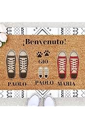Puoi anche includere il tuo amico peloso! Fibra Di Cocco Zerbino Personalizzato - La Famiglia Zerbino Uv Personalizzato *Si prega di notare che la stampa viene eseguita sui filamenti della fibra di cocco, non è una stampa su una superficie liscia. A NANNUK Siamo produttori Essendo produttori di zerbini possiamo permetterci di consegnare con la massima qualità e rapidità il tuo zerbino personalizzato! Zerbino da esterno personalizzato con logo: il tappeto 4 stagioni · blog · Cosa può fare per te un tappeto asciugapassi personalizzato Consigli per la manutenzione e altri modelli: Dai un'occhiata alle recensioni dei nostri clienti! Zerbino personalizzato NANNUK Alla ricerca di uno zerbino d'ingresso a casa? Progetta il tuo zerbino con tutti i nomi della tua famiglia! Ideale per l'ingresso della casa: proteggi il pavimento del tuo ingresso con uno zerbino personalizzato, con questo zerbino otterrai un ingresso pulito a casa poiché la fibra di cocco è un prodotto naturale con la capacità di rimuovere lo sporco dalle tue suole. Facci sapere se è per un regalo e ti aiuteremo! Scegli il tuo design preferito (abbiamo più di 50 modelli diversi)Scrivi i nomi dei membri della tua famigliaScegli la tipografiaQualche dubbio? Ti aiutiamo! Puoi aggiungere messaggi, frasi o persino impronte del tuo cane o gatto: E se ho un altro animale domestico?... Non preoccuparti che abbiamo anche impronte di tartaruga, coniglio, cavallo...Uno zerbino molto unico Gli zerbini della famiglia Nannuk sono molto facili da personalizzare! Stampa UV di alta qualità La stampa della personalizzazione del tuo zerbino è realizzata in UV. Ogni zerbino può contenere venature o variazioni di tono naturale nelle fibre di cocco. Spedizioni MOLTO VELOCE Personalizziamo il tuo zerbino in meno di 72H. Naturale: essendo realizzato in 100% fibre di cocco naturale, è un prodotto con il quale contribuiamo al mantenimento sostenibile dell'ambiente. Regalo personalizzato: hai bisogno di un regalo originale per un amico? Ti piacerebbe sorprendere la tua famiglia? Vuoi ricevere i tuoi ospiti in modo divertente? Zerbino personalizzabile per la tua famiglia, i tuoi amici, i coinquilini e persino i tuoi animali domestici, crea un regalo unico assicurato!