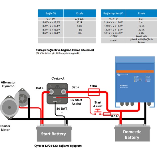 The Cyrix Battery Combiner is a microprocessor controlled heavy duty relay that automatically connects batteries in parallel when one of them has reached a pre-set voltage, and disconnects when the voltage decreases below float level Victron Energy Cyrix guarda la tendenza generale (tensione in aumento o in diminuzione) e inverte un'azione precedente solo se la tendenza si è invertita durante un certo periodo di tempo; il ritardo temporale dipende dalla deviazione di tensione dalla tendenza Il monitoraggio intelligente della batteria previene cicli: il software di Victron Energy Cyrix fa più che semplicemente collegare e scollegare in base alla tensione della batteria e con un ritardo fisso. Victron Cyrix-ct 12/24V-120A Battery Combiner Kit - Victron Energy Victron Energy Cyrix-ct 12/24-120 è un relè sensibile alla tensione bidirezionale, quindi si attiverà anche se per esempio la batteria ausiliaria viene caricata da un caricatore per batteria Questo Kit Combinatore di Batterie consente di aggiungere 2° o 3° sistema di batterie nella tua auto, barca, RV o qualsiasi altro veicolo