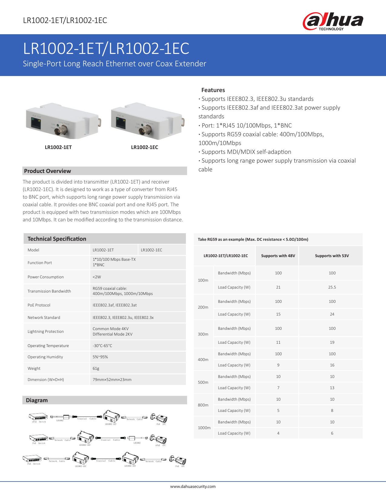Extender Ethernet a lunga portata su cavo coassiale a porta singola ( modello trasmettitore ) Il prodotto è progettato per funzionare come un tipo di convertitore da RJ45 alla porta BNC, che supporta la trasmissione di alimentazione a lungo raggio tramite Prolunga Ethernet LR1002-1ET-V3 - Převodník Eth/koax, Dahua EPoE Norma, Vysílač Prolunga Cavo Ethernet Dahua LR1002-1ET - Prolunga trasmettitore Ethernet con cavo coassiale a lunga portata