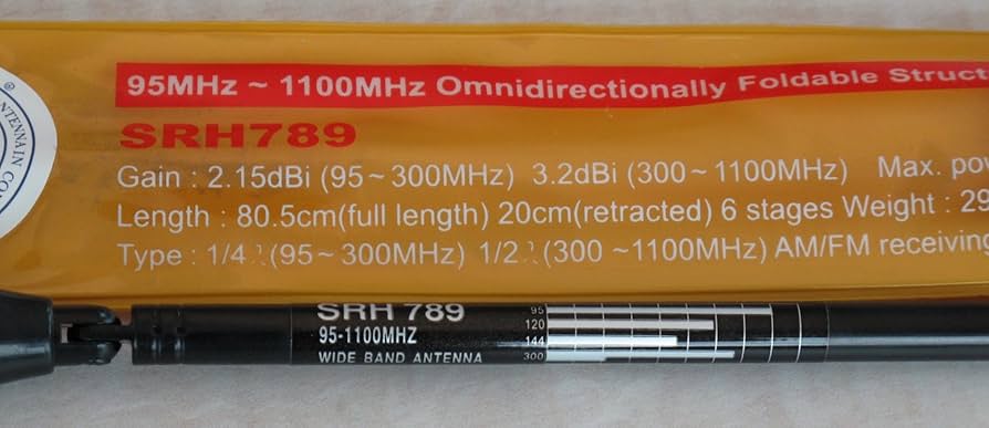 Gain(MAX): 2.15dBi(95~300MHz) / 3.2dBi(300~1100MHz). Frequency: 95MHz- 1100MHz Dual Band & Wide Band. Connector: SMA -Male/ SMA -female. Length: 20cm(80cm full stretch Harvest Srh789 Sma-female 95-1100mhz Foldable Wide Band Telescopic Frequenza: doppia banda 95MHz-1100MHz e banda larga Potenza massima: 10 W. Impedenza: 50 OHM