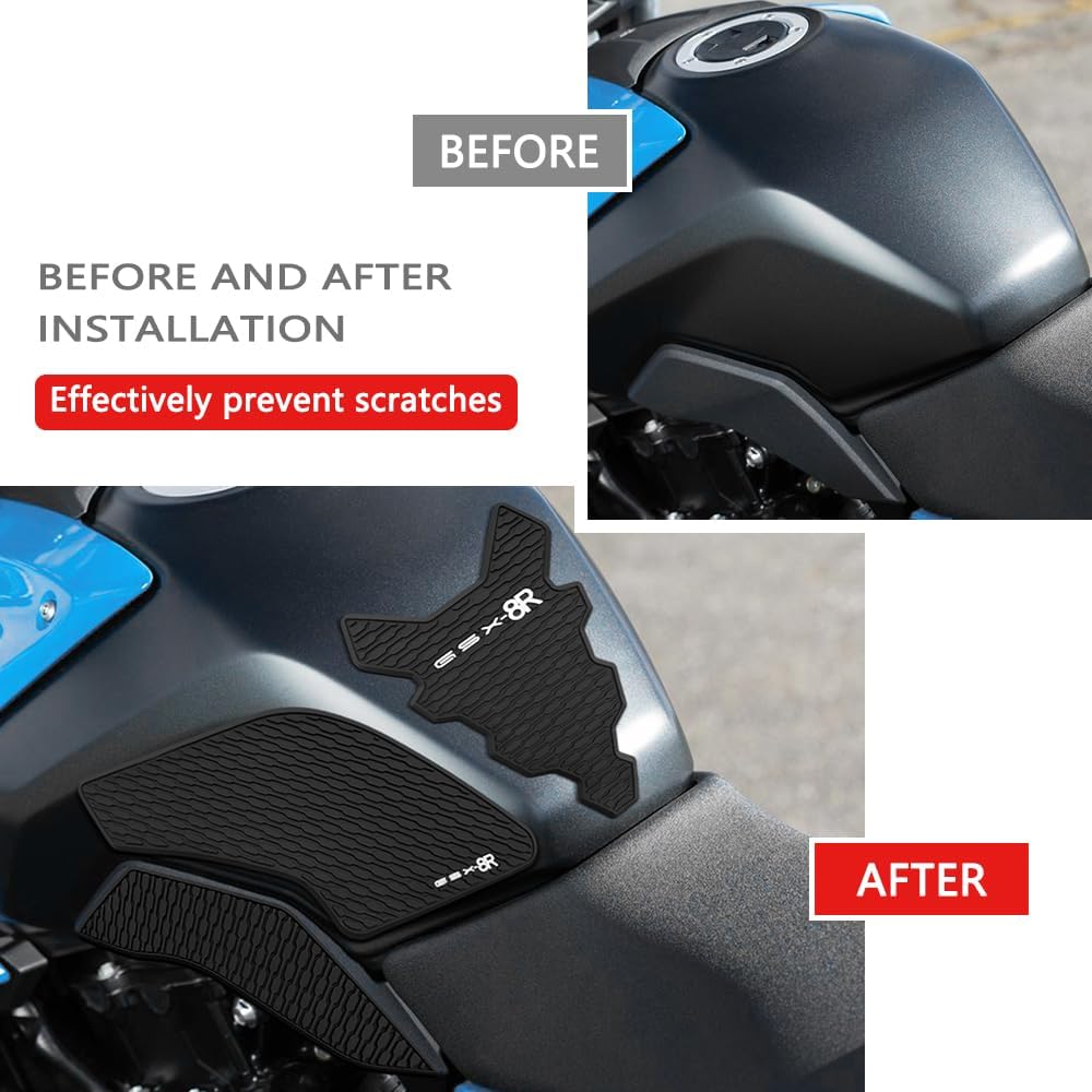 Motorcycle Accessories Tank Grips/Anti-slip Pads/Traction Non-Slip Mats Fuel Tank Protection For Suzuki GSX-8S 2023+ / GSX-8R 2024-2025 Description Report Item For 2023 2024 GSX-8S tank pad Adhesive resinated protections for the side tank of the motorcycle tank. Specially designed tank side pads to match the Speed Triple 1200 RR. It not only prevents scratches on the tank, but also improves the knee grip ★GSX-8S gsx8s traction pads Easy to use and install, with adhesive on the back, easy to peel and stick ★GSX-8S gsx8s tank grips The traction pad makes it very easy to grip and ride, and it requires less energy to grip the car. ★2023 2024 gsx8s accessoriesThe greater the friction force, the safer it is It is durable and sturdy, with excellent adhesive quality, and can be used for a long time. ★Made of high-quality rubber, it is scratch resistant, slip resistant, and waterproof, providing better protection.